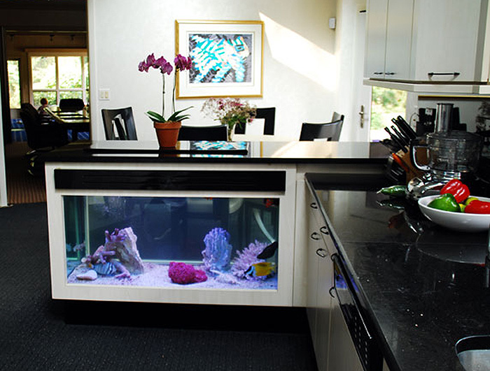 Şimdi de yapması imkansız değil ama zor da olsa ada mutfak terimini gerçeğe dönüştürüp, mutfaklarında koca koca tanklardan irili ufaklı akvaryumları kullanan mutfaklara değineceğiz. Kim bunlara sahip olmak istemez ki? (: