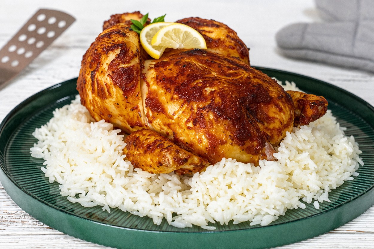 Kızarmış tavuk hazır. Pirinç pilavı ile servis edin. Afiyet olsun!