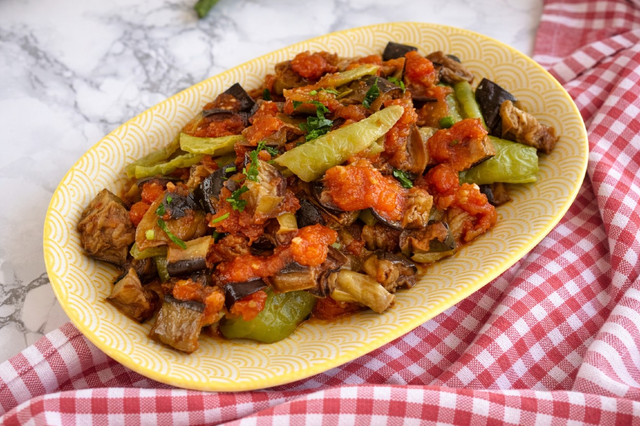 Mutfağımızın en sevilen meze tariflerinden olan şakşuka, orijinal tarifinde patlıcan ve biberlerin kızartılması ve domatesli sosla servis ediliyor.