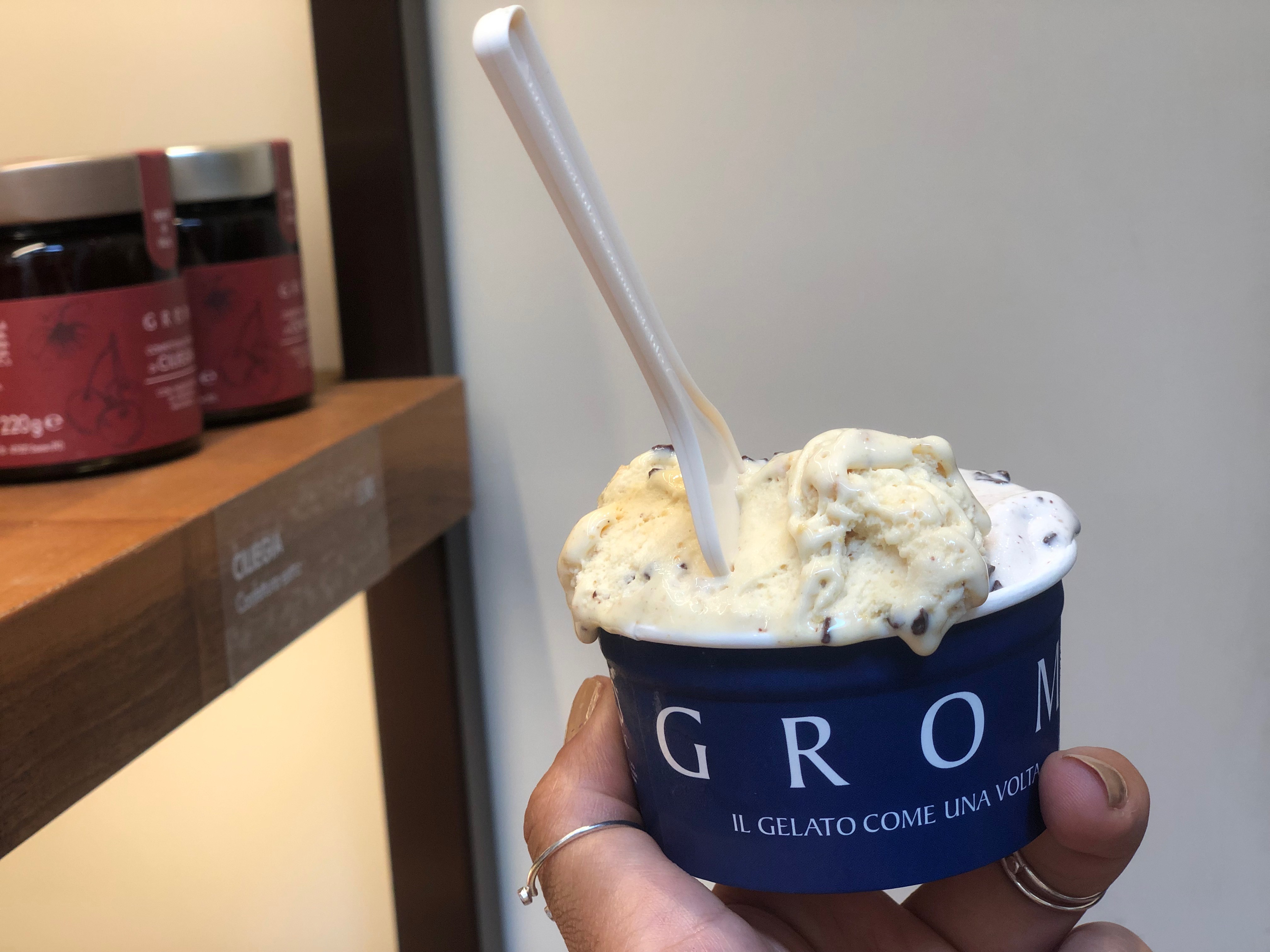 Ama içlerinden seçip iki tanesini listeye eklemeye karar verdim. Burası da şehir içinde başka yerlerde de şubesi olan bir yer. Mutlaka gidip enfes dondurmalarını denemelisiniz. Yaklaşık 17 çeşit dondurma mevcut. Sütlülerin yanı sıra sorbe çeşitleri de mevcut. Ben "Crema di Grom ve çikolata parçacıklı Stracciatella" tercih ettim ve mükemmeldi. Burada dondurma seçeneklerinin altında İngilizcesi de bulunuyor ve seçmek bu şekilde daha kolay oluyor.