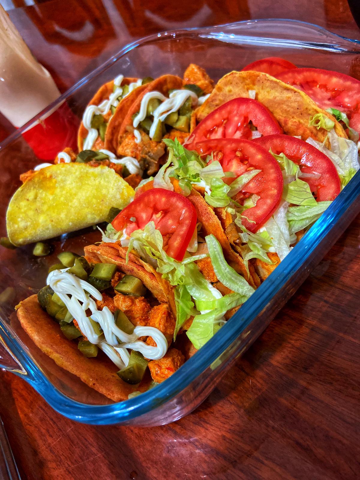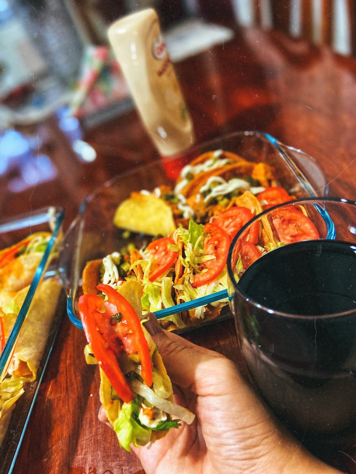 Ben genellikle taco'nun içine tavuk eti koyuyorum. Sebze olarak California biberlerin sarı ve kırmızı olanlarından ve biraz mantar koyup kavuruyorum. Arasına bolca kaşar peyniri serpip etli harcı koyuyorum. Bazen arasına tatlandırılmış avokado püresi de koyuyorum, üzerine ise bol mayonez ve acı sos. Ee yeşilliksiz olmaz tabi