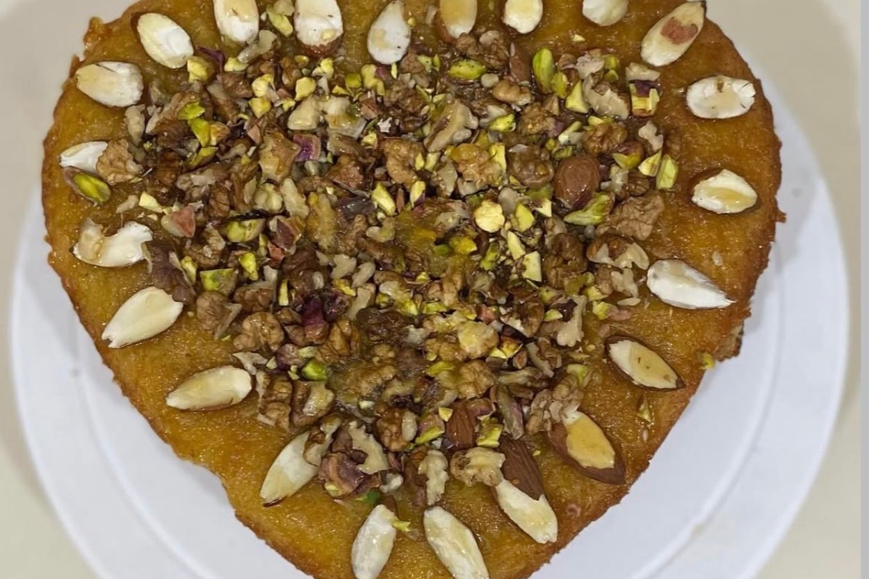 - Yağladığım kalp şeklindeki kalıbıma döküyorum. Bütün çiğ bademleri harcın üzerine, piştikten sonra her dilime bir badem denk gelecek şekilde, hafifçe bastırarak düzenli aralıklarla diziyorum. Aralara biraz da ceviz içi serpiştiriyorum.