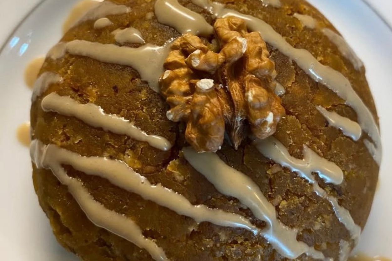 - Son olarak servis ederken üzerine tahin ve cevizle süsleyip servis edelim. Bal kabaklı tereyağlı helva hazır. Afiyet olsun.