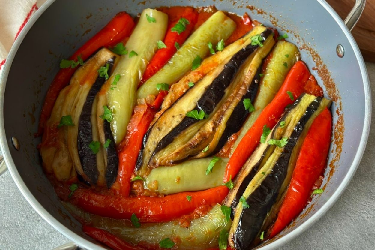 Az malzemeyle hazırlanan bu sebze yemeği, doğru teknikle pişirildiğinde damaklarda iz bırakan bir lezzete dönüşecek. Kızgın yağda altın rengini alan patlıcanlar biberlerle buluştuğunda ortaya kusursuz bir uyum çıkar. Soğan ve sarımsak tencerede yavaş yavaş renk alırken mutfağı saran kokular damakları sulandıracak. Üstüne bir de domates eklendi mi lezzet şöleni vejetaryen sofralara gelmeye hazır.