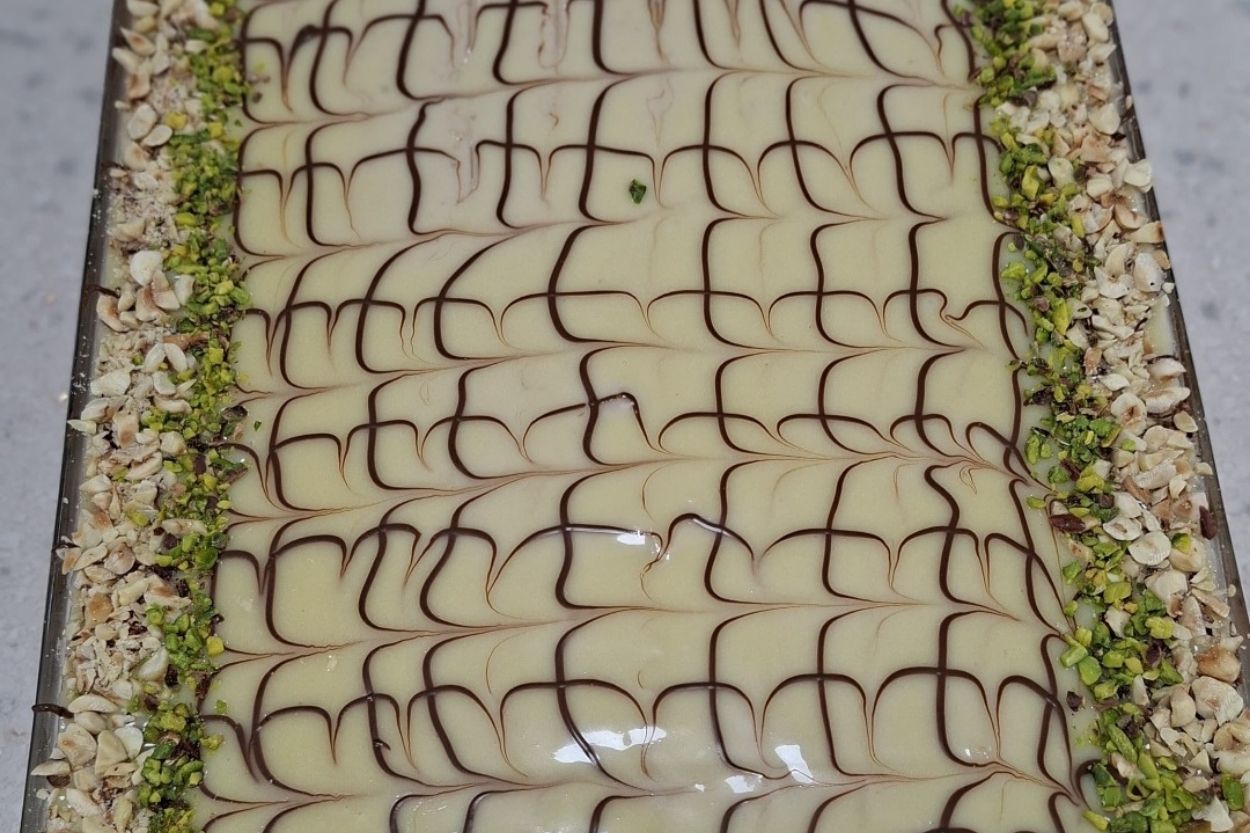 - Tamamen ılıyan beyaz ganajı, kremalı pastamızın üzerine döküp yayın. Üzerine poşetle erittiğiniz sütlü çikolatadan yatay, paralel çizgiler sıkın.