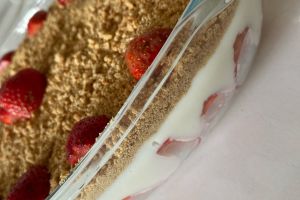 - Bisküvileri toz haline getirin ve borcamın zeminine yarısını yayın.