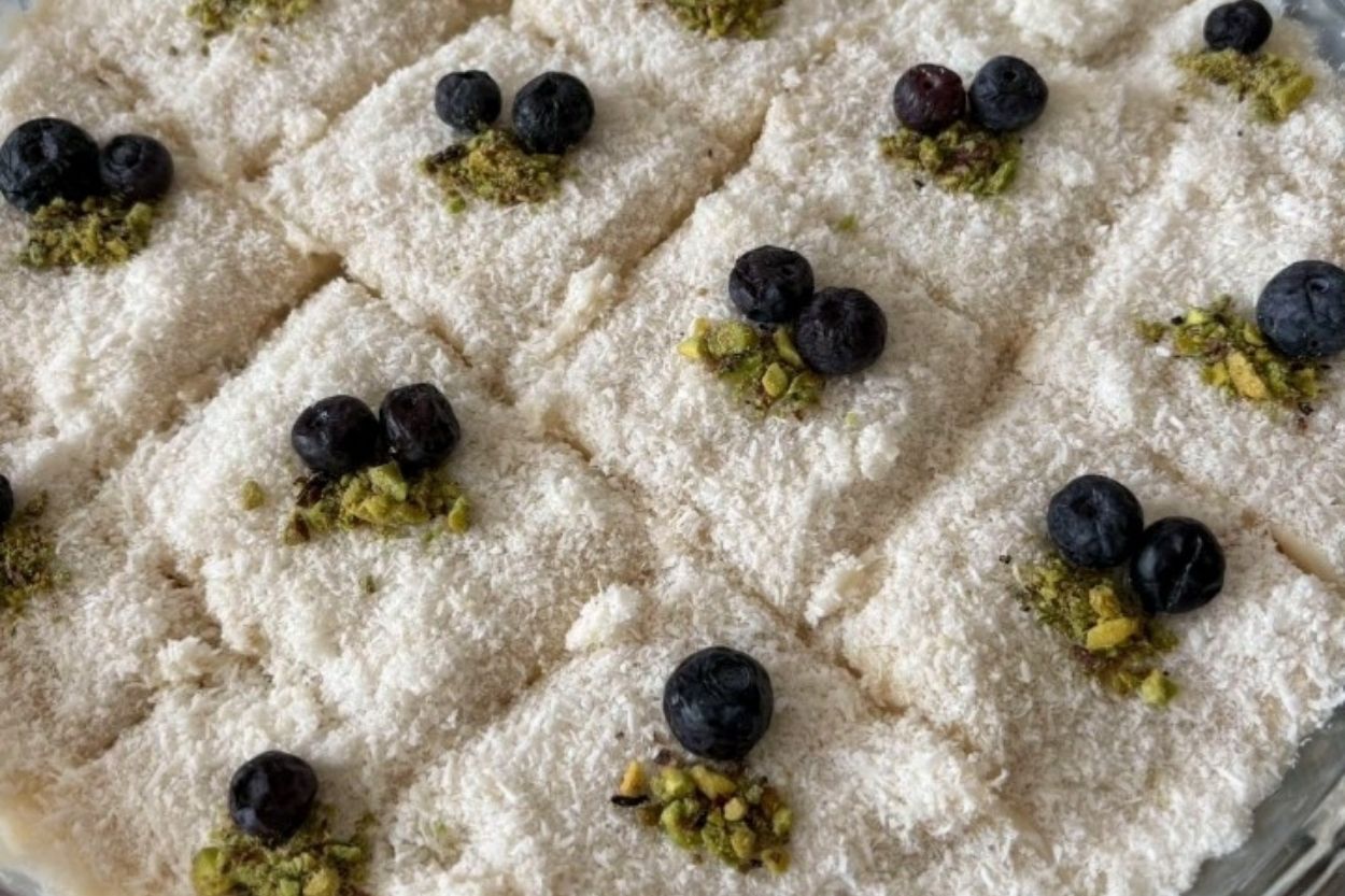 - Hazırladığınız kremayı kekin üzerine eşit şekilde yayın. Üzerini tamamen kaplayacak kadar Hindistan cevizi tozu serpin.
