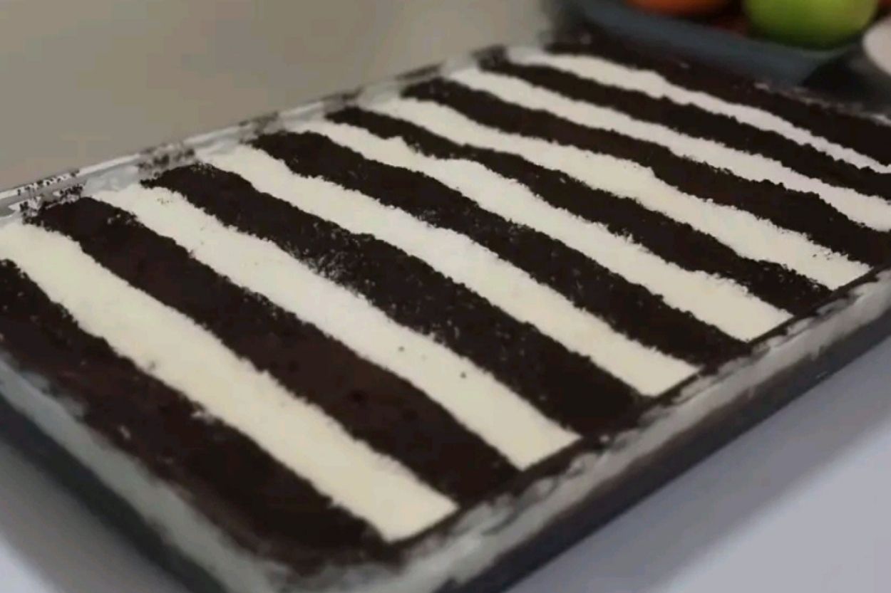 - Beyaz muhallebinin üzerine belirli aralıklarla kağıt şeritler kesip yerleştirelim. Şeritlerin arasında kalan boşluklara bolca kakao serpelim.