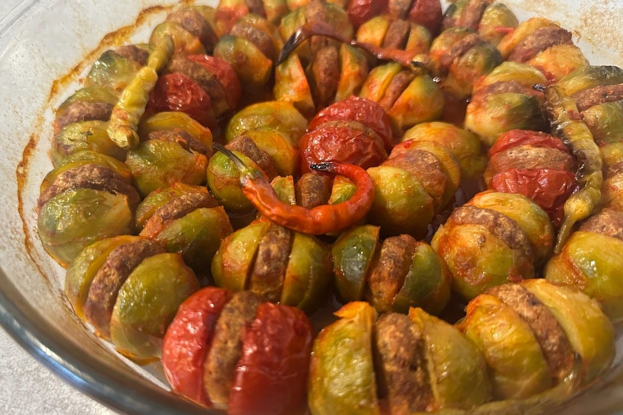 - Hazırladığımız Brüksel lahanalarını fırın tepsisine diziyoruz ve üzerine sivri biberleri yerleştiriyoruz. Sosu için gerekli olan tüm malzemeleri karıştırıyoruz ve lahanaların üzerine gezdiriyoruz.