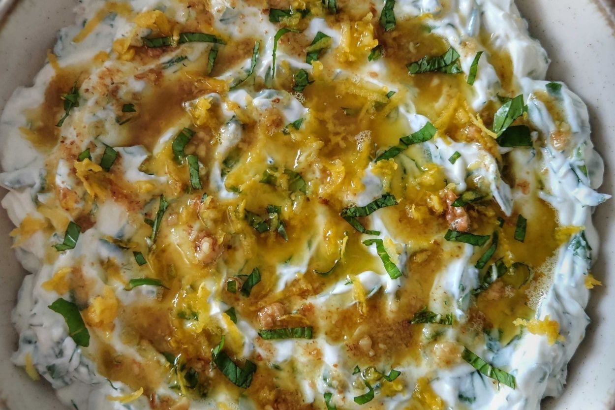 - Limon kabuğu rendesi ve taze nane serperek servis edebilirsiniz. Çağlalı kuru cacık hazır! Afiyet olsun.