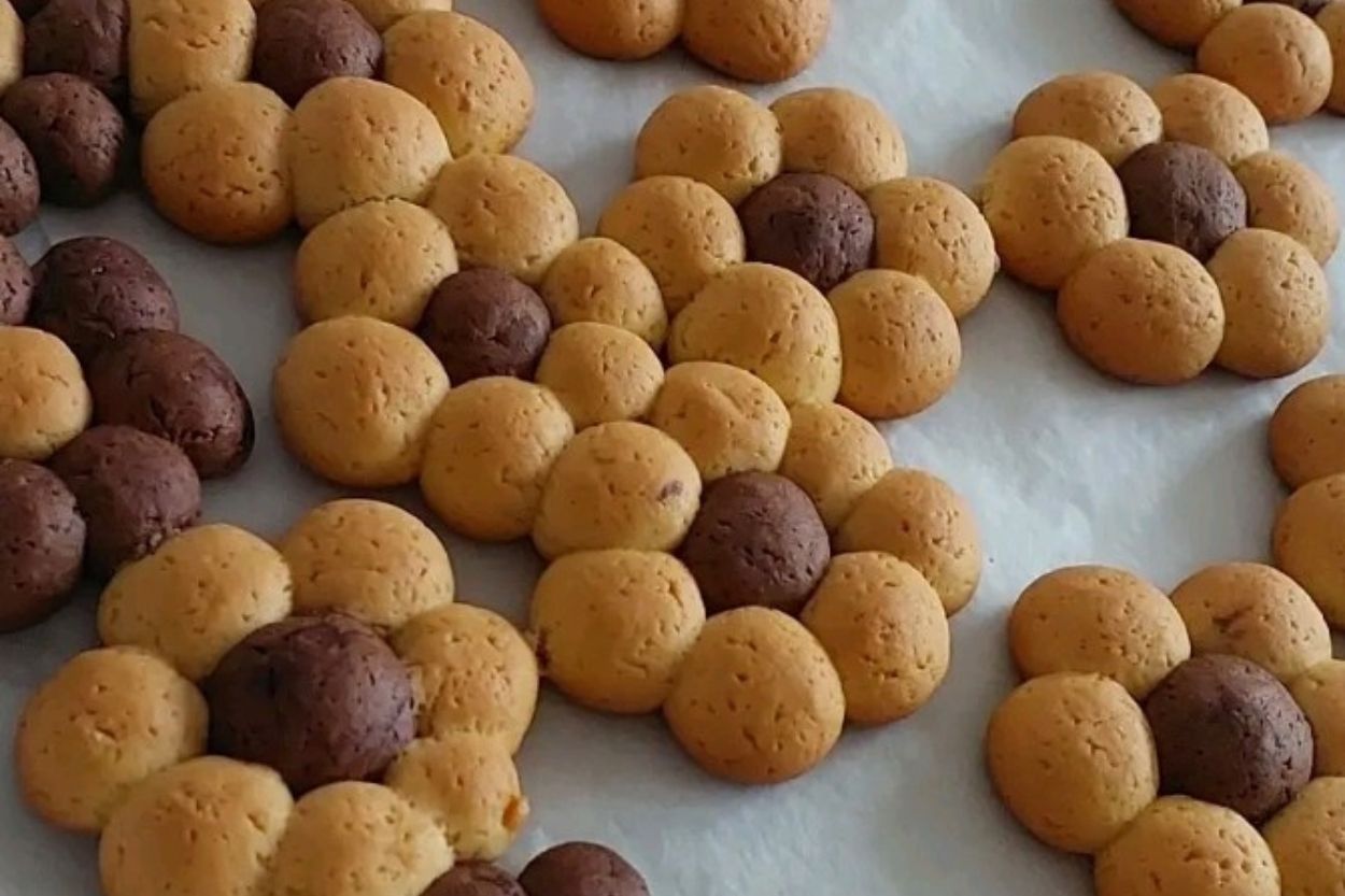 - Her iki hamurdan da küçük parçalar alıp yuvarlayalım. Bir renk hamurdan bir parça alıp ortaya koyalım. Altı tane diğer renkten hamur parçalarını etrafına yerleştirelim ve hafifçe bastıralım ki pişerken dağılmasın. Bu işlemi tüm hamurlar bitene kadar tekrarlayalım.
