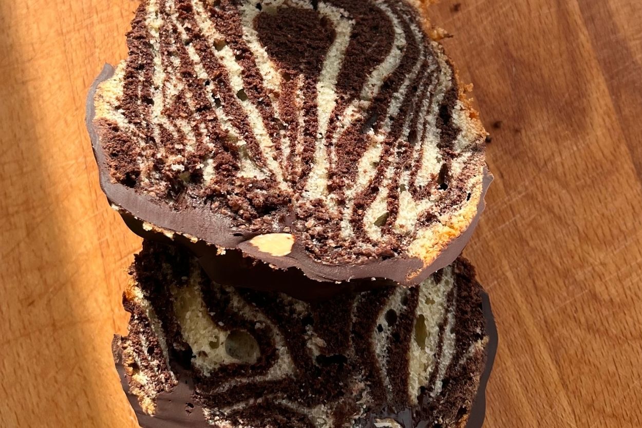 - Yağlanmış kek kalıbına sade ve kakaolu harçtan birer kaşık olacak şekilde sırayla dökelim. Ardından çöp şiş yardımıyla üzerini şekillendirerek desen verelim.