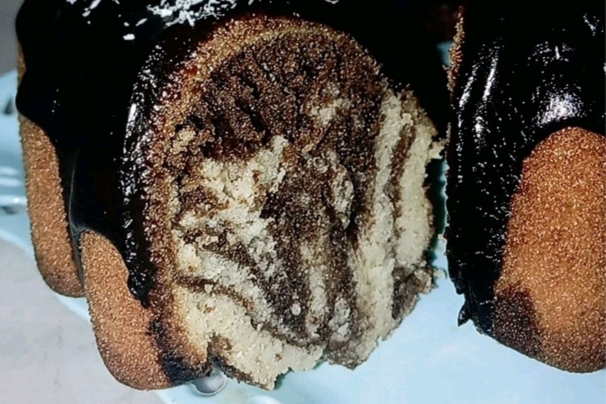 - Güzelce yağladığım kek kalıbına önce sade hamuru, ardından da kakaolu hamuru döküyorum. Elime bir kaşık alıp, hamurun derinliklerine dalarak dairesel hareketler çiziyorum.