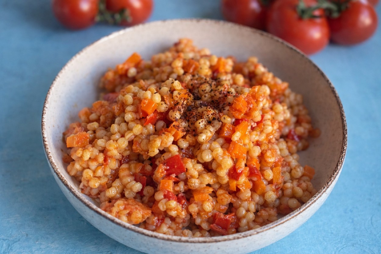 Domatesli kuskus, bir makarna türevi olan kuskusun; domates, kapya biber ve havuç gibi sebzelerle karıştırılıp demlenmesiyle hazırlanan bir pilav tarifi. Et ve tavuk yemeklerinin yanında doyurucu yan öğünler arasında başı çekiyor.