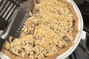 - İç malzemeyi kalıba dökelim. Ve üzerine kalan hamuru rendeleyerek veya kendi hayal gücünüze göre kafes şeklinde yerleştirelim.