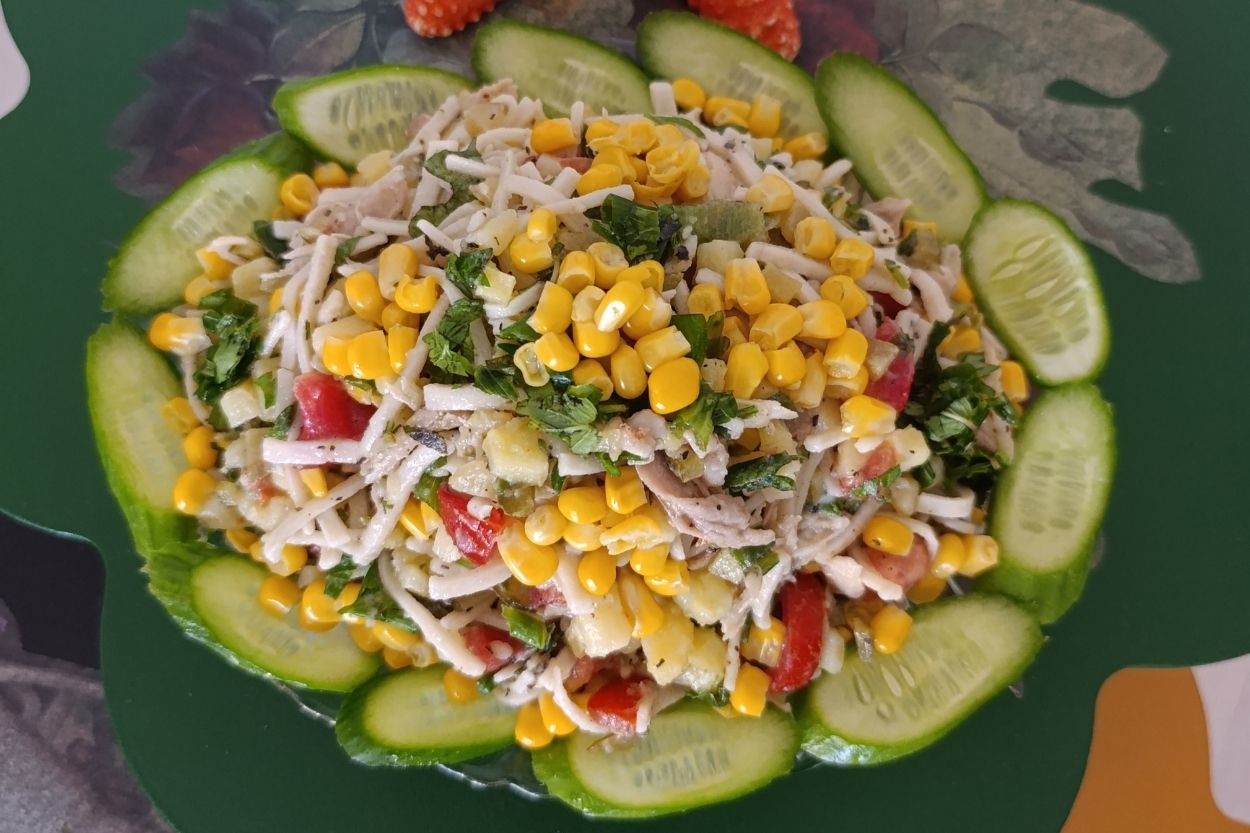 - Üzerine haşladığımız tavuğu didikleyelim. Soğumuş erişte ve haşlanmış mısırla beraber kaba ekleyelim.
