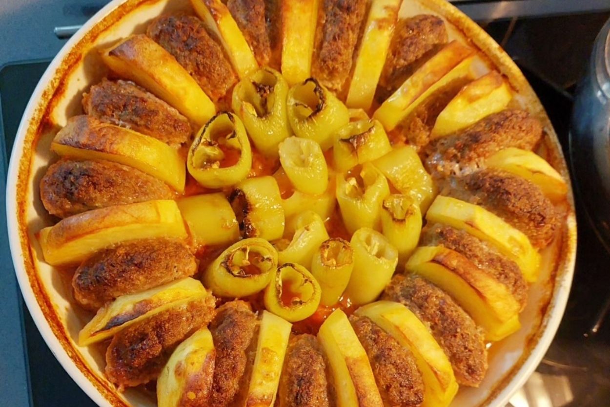 Ev usulü fırın köfte patates tarifi, pratik yapılışı ve fırından yükselen mis gibi kokusuyla akşam yemeği sofralarının olmazsa olmaz lezzetlerinden biri. Nar gibi kızarmış köfte ve patatesler her lokmada sizi mest etmeye hazır.