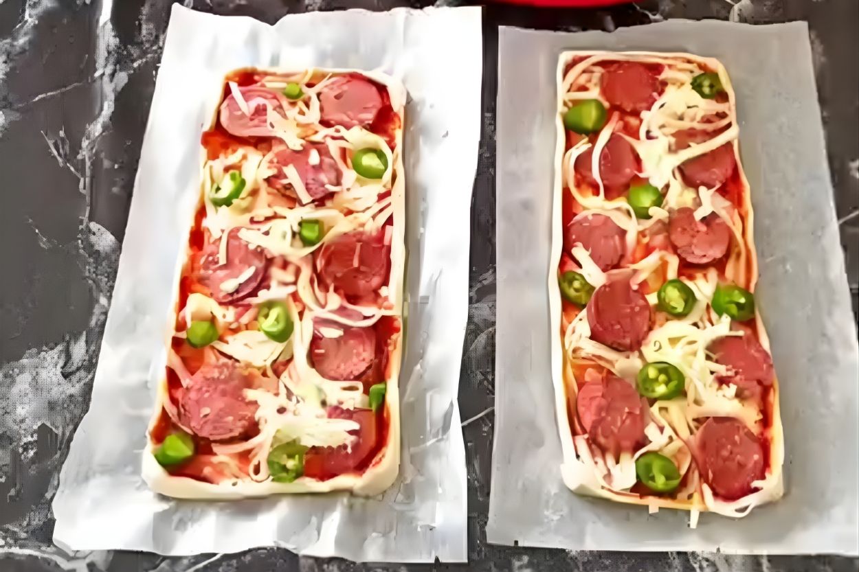 - Ortadan kesilmemiş milföy hamurunu merdane yardımıyla hafifçe bastıralım ve dikdörtgen şekli verelim. Kenarlarını katlayıp kap şeklini verelim, böylece sos ve malzemeler taşmaz.