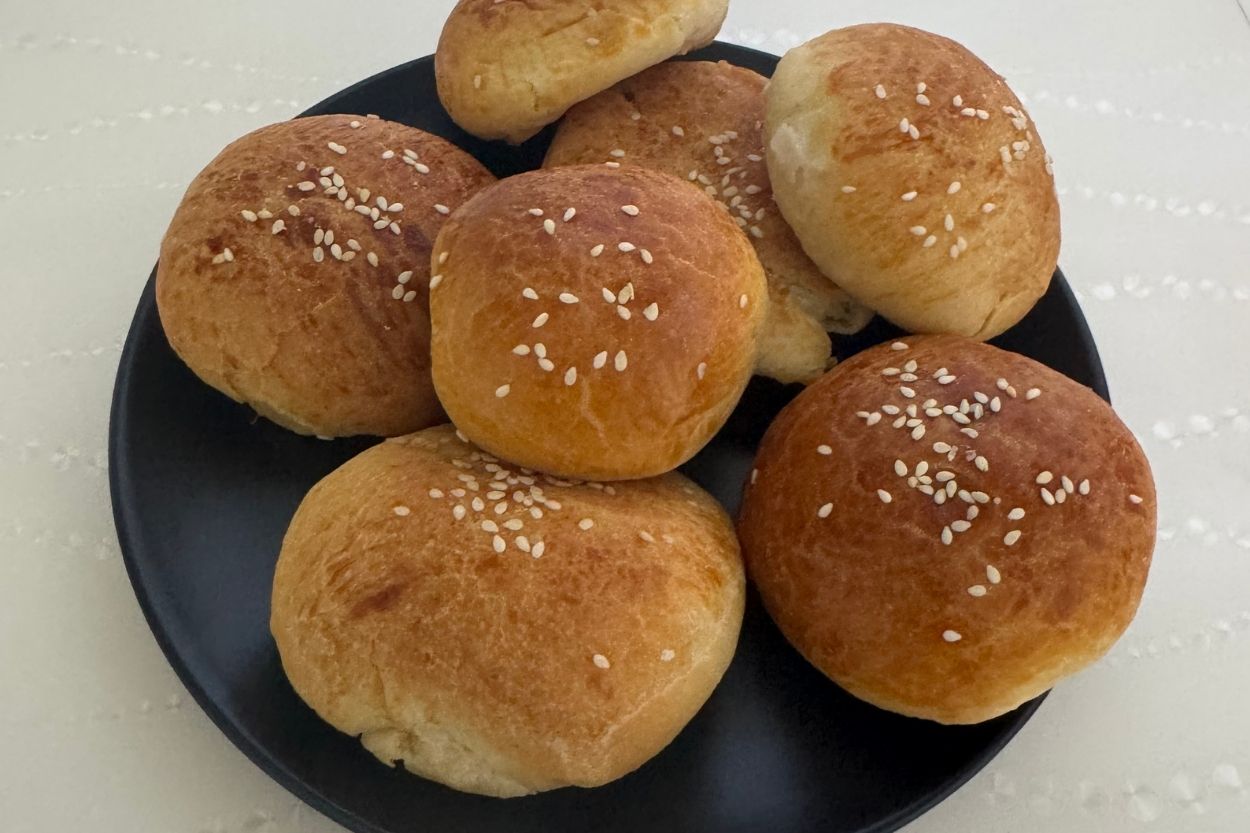 - Hazırladığın poğaçaları yağlı kağıt serilmiş fırın tepsisine dizelim. Tepside de yaklaşık 15 dakika bekletelim, bu ikinci mayalanma oluyor ve poğaçalar daha yumuşak oluyor bu sayede. Üzerlerine yumurta sarısı sürelim. Susam serpelim.