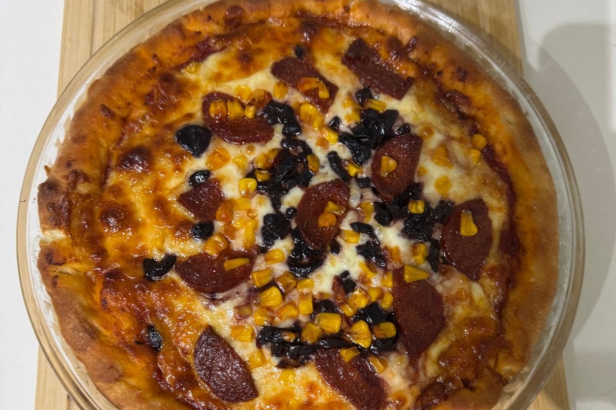 - Hamurun ortasına ince bir kat sos sürün. Üzerine az kaşar serpin, ardından sucuk dilimlerini yerleştirin. Mısır ve dilimlenmiş zeytinleri serpiştirin. En üste tekrar az kaşar ekleyin.