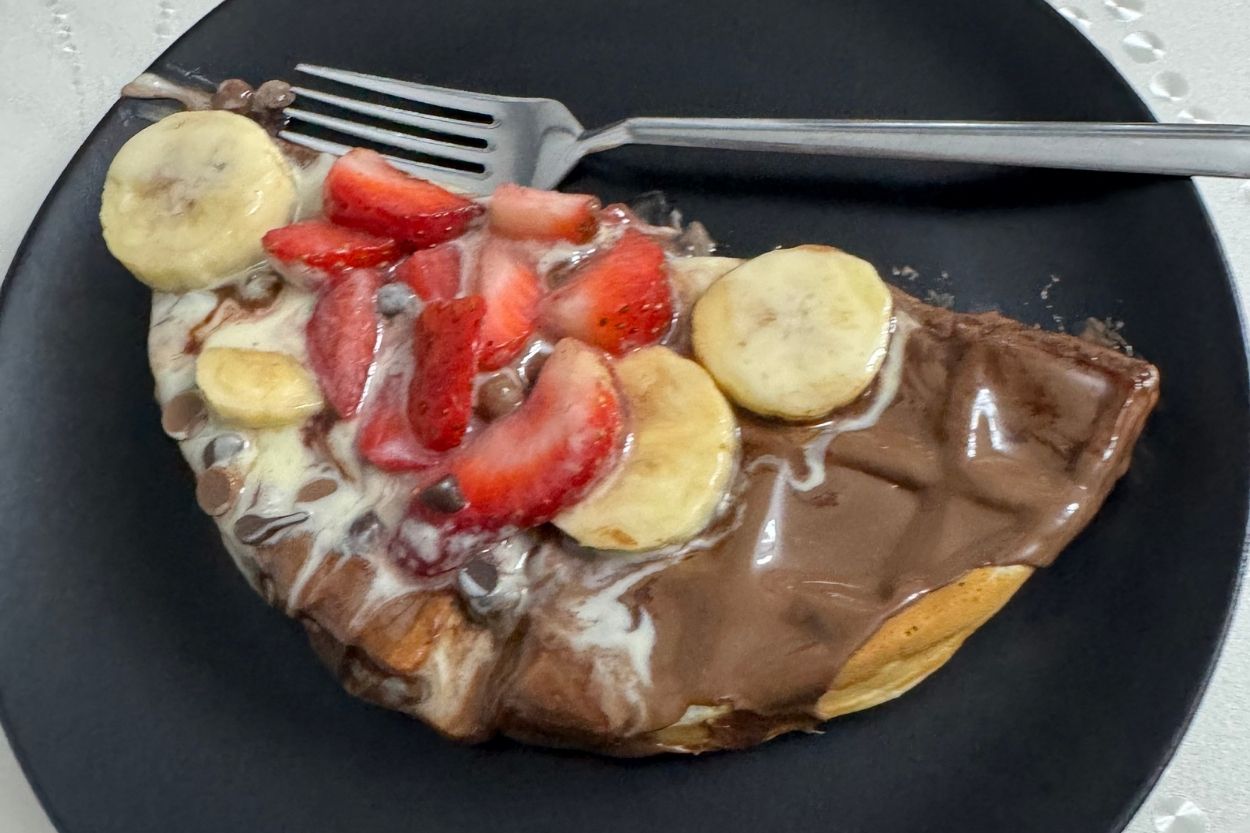 - Pişen waffle’ı tabağa alalım. Üzerine önce çikolata kreması sürelim. Sonra dilimlenmiş muz ve çilek koyalım. İsterseniz çikolata parçaları serpiştirebilirsiniz. Üstüne biraz süt ya da beyaz çikolata sosu gezdirelim daha sonra.