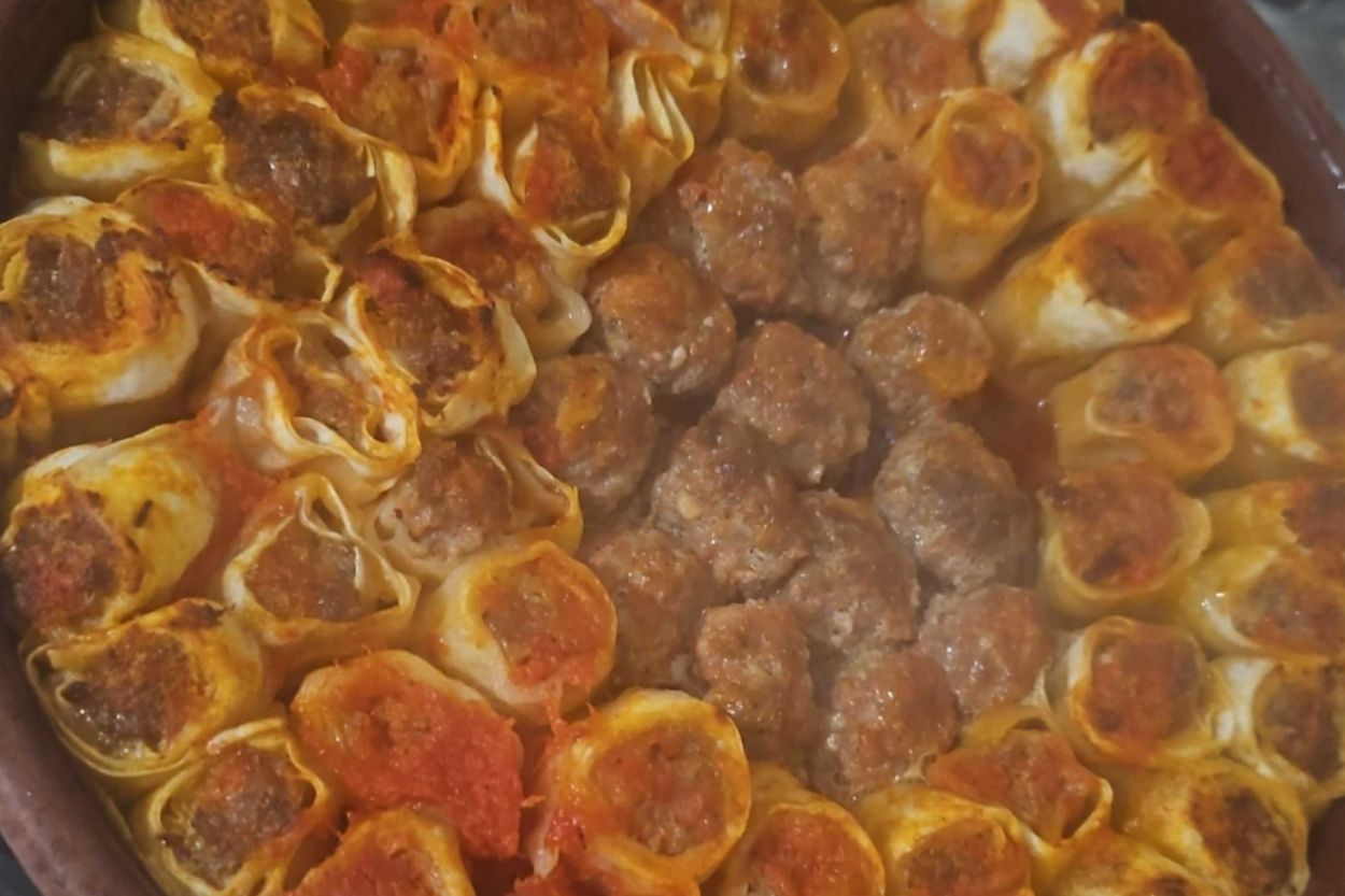 - Ardından yufkayı sarıp eşit parçalar halinde keserek tepsiye yerleştiriyoruz. Bu işlemi yufkalar bitene kadar tekrarlıyoruz.