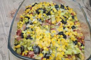 - Üzerine mısır, zeytin dilimleri, sucuk ekleyin.