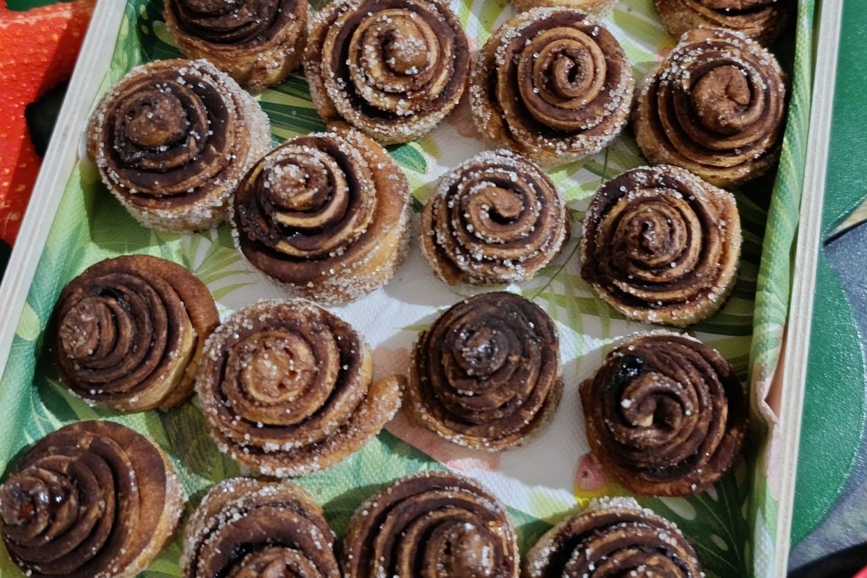 - Tüm rulolar hazır olunca kenarlarını ve üzerini şekere bulayalım. Önceden ısıtılmış 180 derece fırında 25-30 dakika, üzeri altın rengi alana kadar pişirelim.