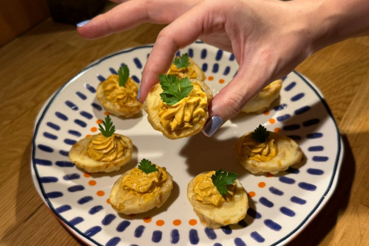 - Mayonez, hardal ve baharatlarla iyice karıştırıp püre haline getirelim. Ardından harcı sıkma poşetine koyalım.