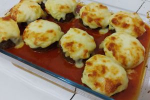 - Pişirdiğimiz köftelerimizin içine garnitür doldurup üstüne sıkma torbası ile veya kaşık yardımı ile püremizden koyarak rende kaşar yerleştiriyoruz. Sosumuzu yanlardan veriyoruz.