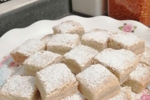 - Soğuyup dinlenen kurabiyeleri bıçakla kare dilimlere bölün. Üzerlerine pudra şekeri serperek servis yapın.