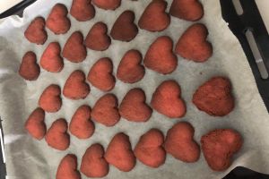 Sevgililer günü öncesinde kolaylıkla hazırlayabileceğiniz az malzemeli ve pratik bir kurabiye tarifi. Tereyağıyla hazırlanan kurabiye hamuru rengini gıda boyasından alıyor, uzun süre saklanabilen kalp kurabiyeler ağızda dağılıyor.