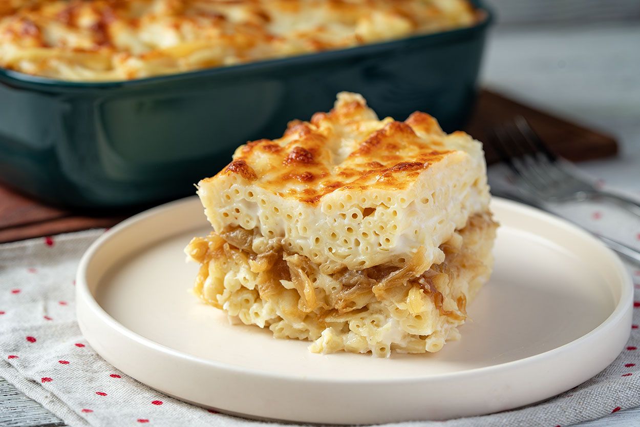 Karamelize soğanlı fırın makarna, fırında makarna tarifinin, karamelize soğan ve beşamel sos ile zenginleştirildiği, sıcak bir ana yemek formu. Kalın boru makarnalar haşlandıktan sonra beşamel sos ile karışıyor, soğan katmanı ekleniyor ve fırın ısısıyla eriyip kabuk bağlanıyor.