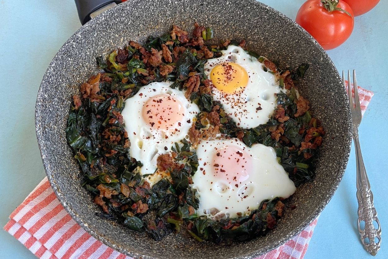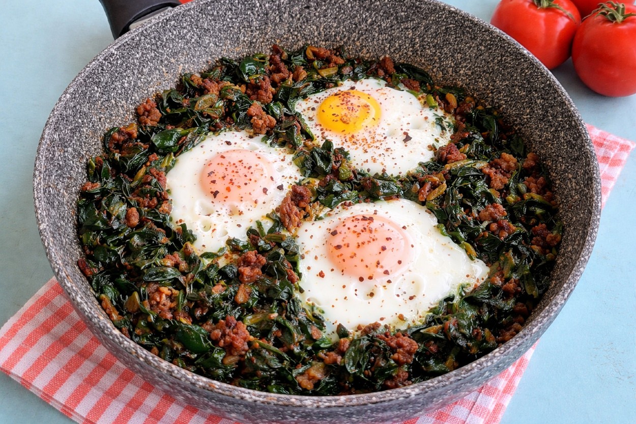 Yeşil mucize olan ıspanak, kavrulmuş kıymanın tadıyla birleşirken; üzerine kırılan yumurtalar yemeğin kucağında yuva kuruyor. Ev yapımı yemek hazırlamanın ritmi, zeytinyağının salçayla birleşimi ve baharatların dokunuşuyla tam bir kahvaltılık kendisi.