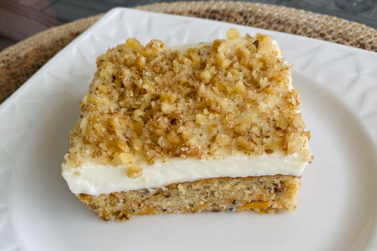 - İkisi de soğuduktan sonra kekin üzerine muhallebiyi ve iri kıyılmış cevizi ekleyip 1 saat dinlenmeye bırakıyoruz. Kremalı tarçınlı havuçlu kek hazır! Afiyet olsun.