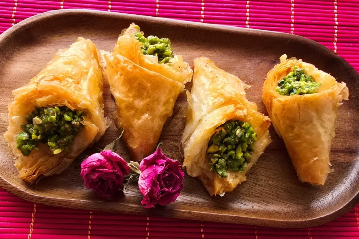 - İri çekilmiş Antep fıstığı, bal ve biraz yağı karıştırarak yoğun kıvamlı bir harç hazırlayın. Fırından çıkan yufkalar ılındığında içlerindeki yağlı kağıtları çıkarın. Oluşan boşlukları hazırladığınız fıstıklı harçla doldurun.