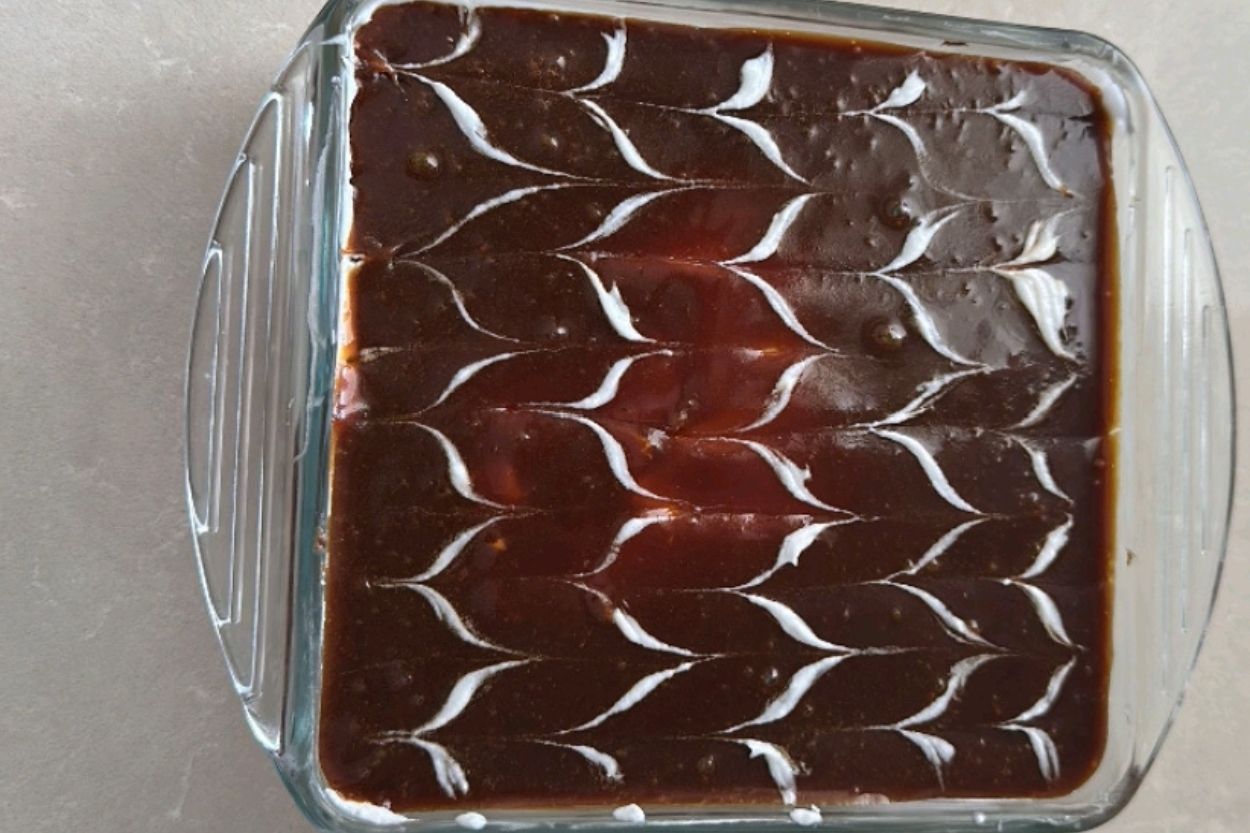 - Kek şerbetini iyice çekip dinlenirken, üzerine süreceğim beyaz tabakayı hazırlıyorum. Yarım paket krem şantiyi, yarım su bardağı buz gibi soğuk sütle kıvam alana kadar çırpıyorum. Kekin üzerine incecik, pürüzsüz bir tabaka halinde yayıyorum. Üzerine yapacağım o meşhur çizgi deseni için bir yemek kaşığı kadar şantiyi kenara ayırıyorum.