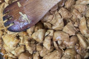- Tavukları küp küp doğrayıp üzerine, mısır nişastası, soya sosu, ayçiçek yağı ve pirinç sirkesi ekleyerek karıştıralım, 30 dakika dolapta bekletelim.