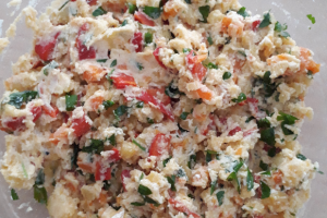 - Üzerine tuzunu, rendelenmiş sarımsağı, ince doğranmış maydanozu ve labne peynirini ilave edin.