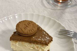 - Soğuyan cheesecake’in üzerine dökün, spatula ile güzelce yayın. Lotus bisküvisi parçalarıyla üzerini süsleyin.
