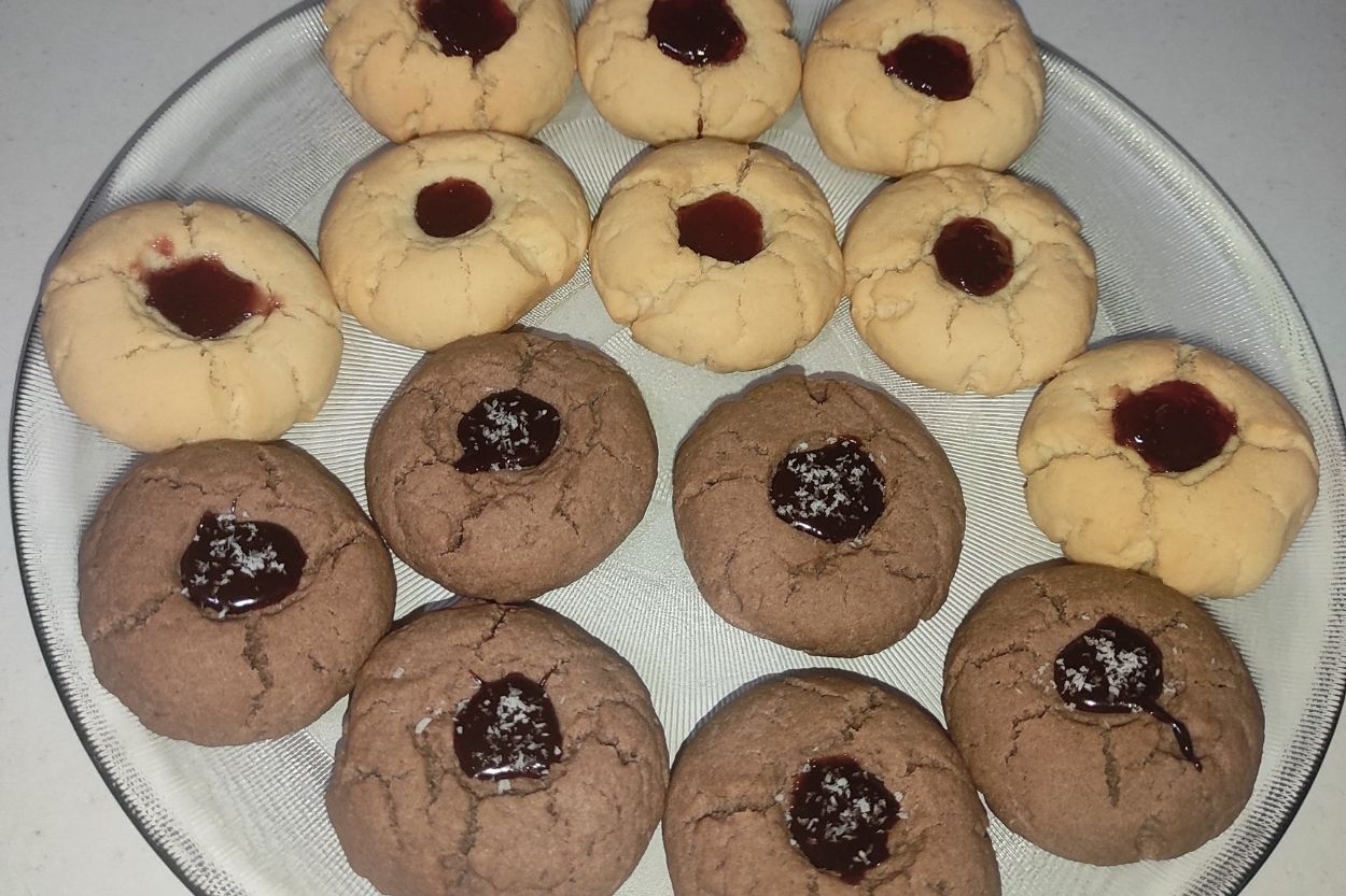 - Fırından çıkan kurabiyelerin ilk sıcaklığı çıktıktan sonra üzerlerine pudra şekeri serpelim. Ardından bir çay kaşığı yardımıyla çilek marmelatını ortalarındaki çukurlara dolduralım.
