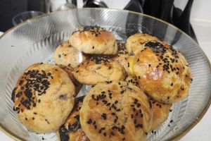 - Hazır olan hamurdan parçalar alarak yuvarlayın ve yağlı kağıt serili tepsiye koyun. Üstüne yumurta sarısı sürüp susam serpiştirin.