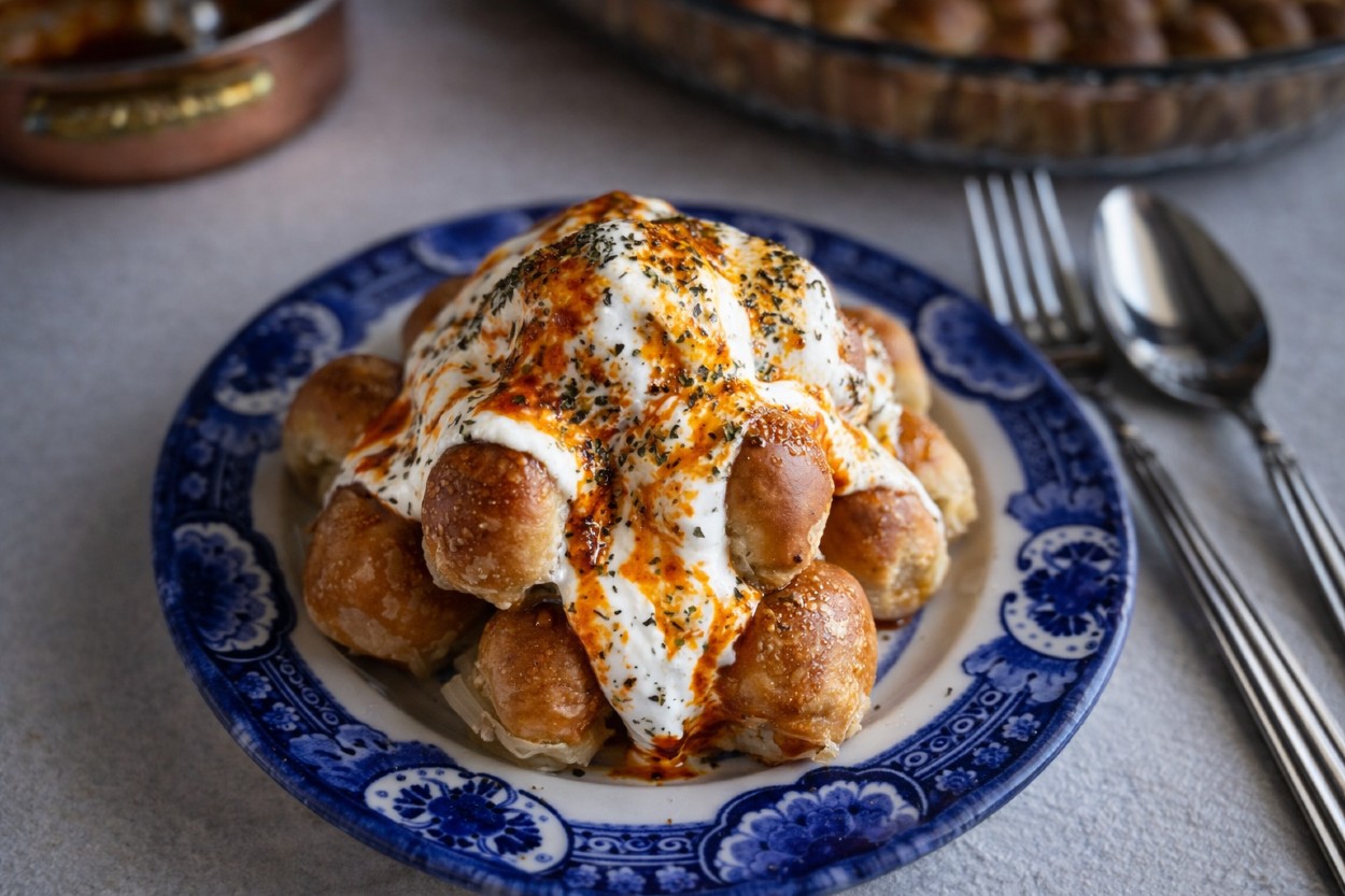 Üzerine sarımsaklı yoğurt sosu dökerek servis edin.