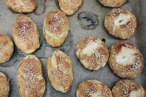 - Poğaçaları aralarında biraz boşluk kalacak şekilde yağlı kağıt serilmiş tepsiye yerleştirin. Ayırdığınız yumurta sarısını pekmezle karıştırıp poğaçaların üzerine sürün ve son olarak susam serpin.