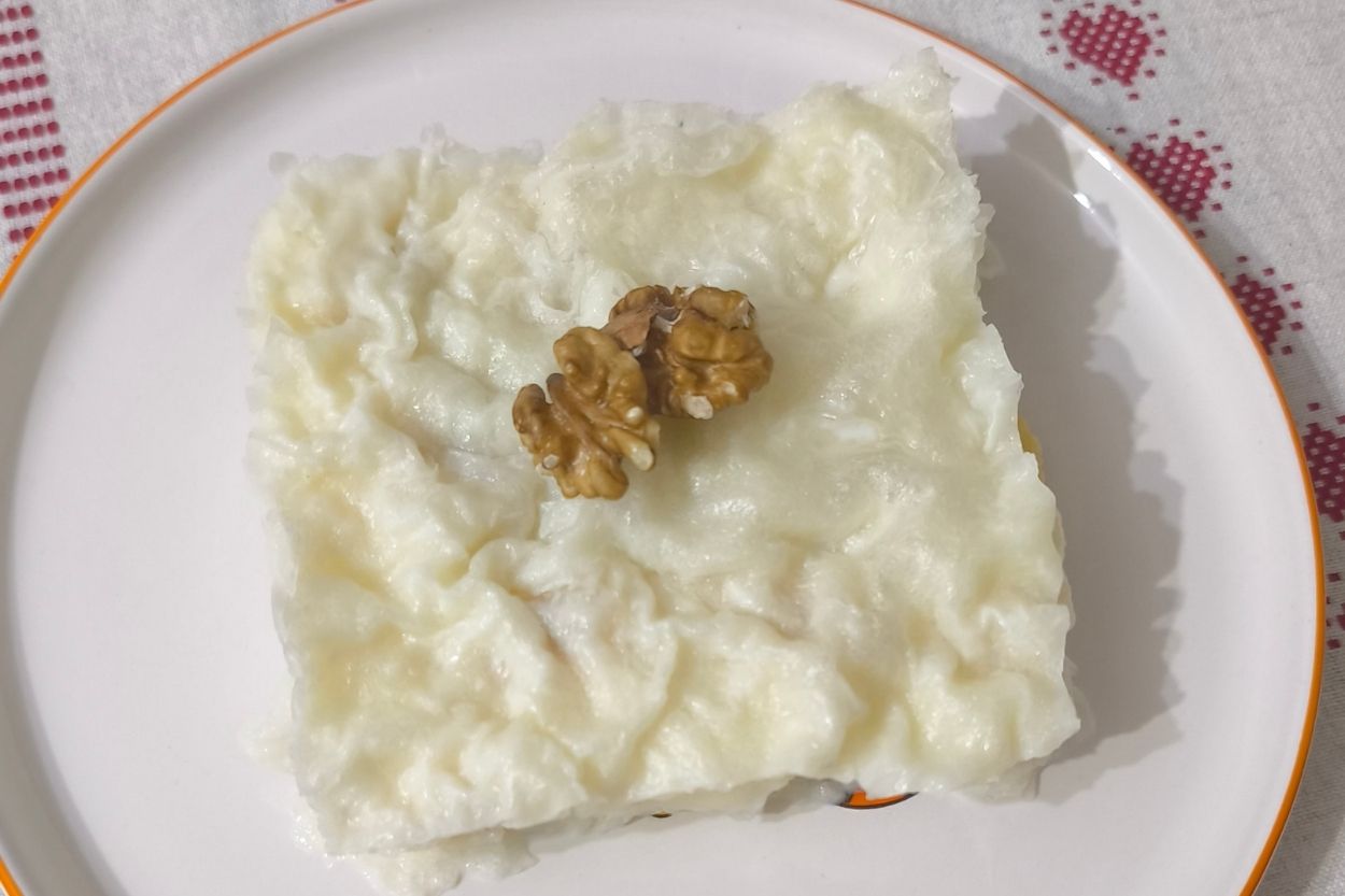 - Kalan 5 adet güllaç yaprağını da aynı şekilde kırarak muhallebinin üzerine yerleştirelim. Her katın arasına yine kepçe yardımıyla süt gezdirerek güllaç yapraklarının tamamen ıslanmasını sağlayalım.