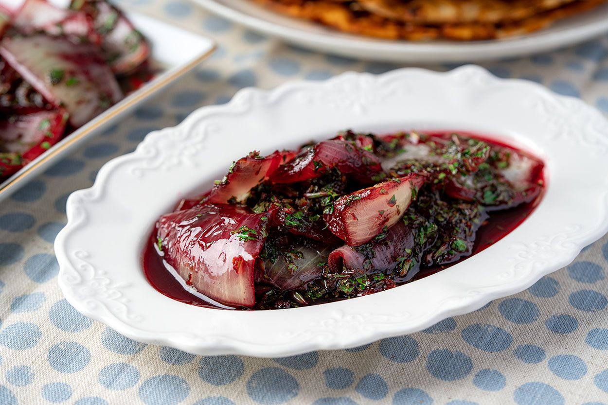 Nar ekşili soğan salatası, kebap, lahmacun ve et yemeklerinin yanına eşlik eden, enfes bir salata. Çoğu zaman çiğden hazırlansa da bu tarifte soğanın yüksek ateşte karamelize edilip nar ekşisiyle bütünleşmesiyle elde ediliyor. Zeytinyağı ve taze maydanozla taçlandırılıp servis ediliyor.