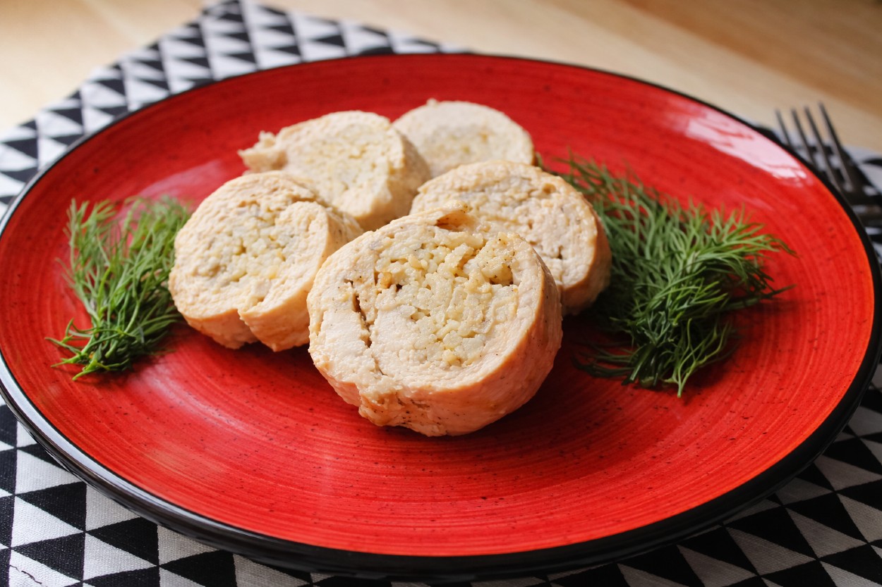 - İncelttiğiniz tavuk etlerini yağlı fırın kağıdının üstüne serin, içine harçtan koyun ve yağlı kağıdın yardımıyla rulo şeklinde sarın. Yağlı kağıtla sardığınız ruloları bir de alüminyum folyo ile kaplayın ve bir fırın kabına yerleştirin.