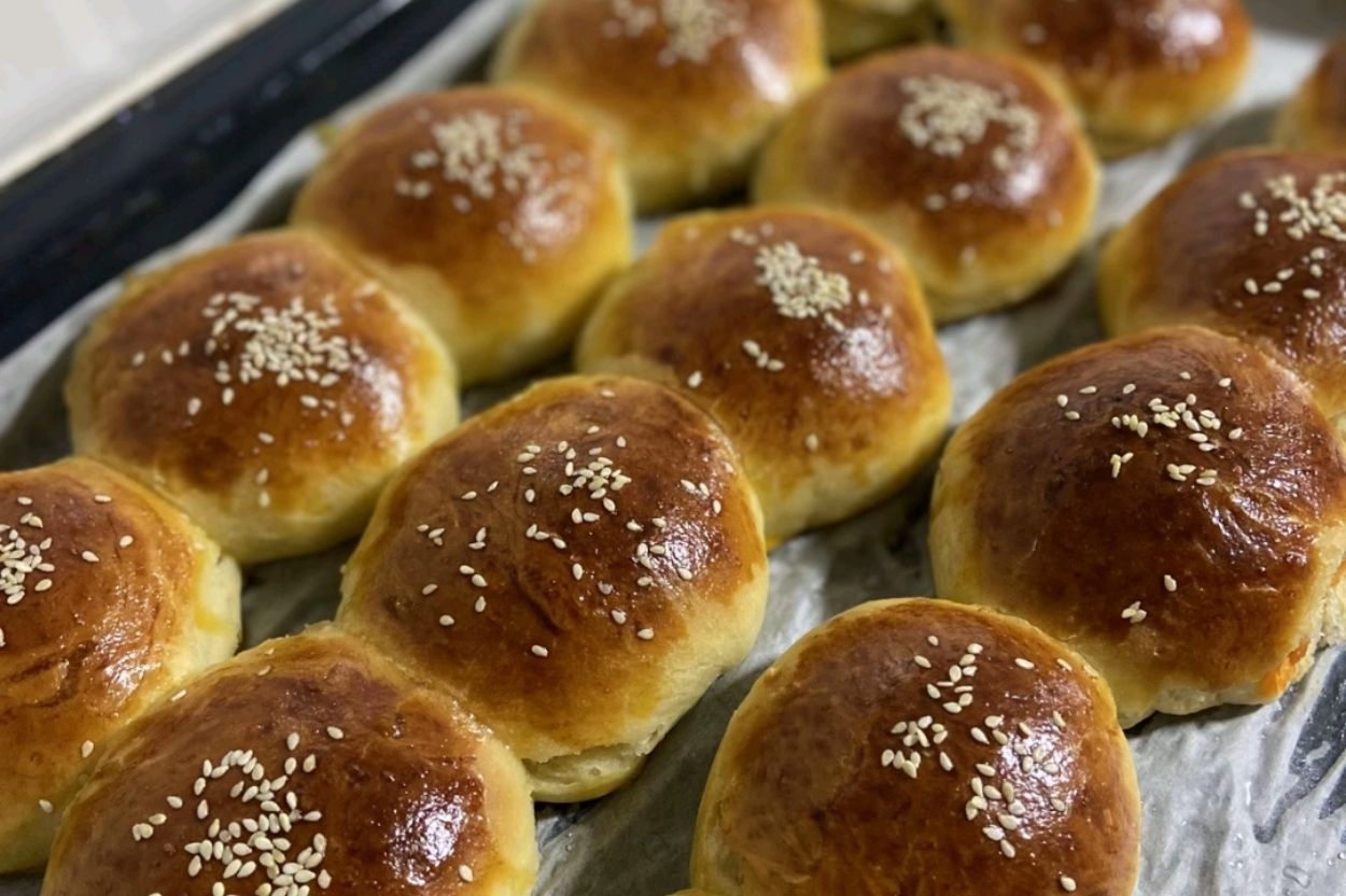 - Poğaçaların üzerine yumurta sarısı sürüp susam serpelim. Önceden ısıtılmış 180 derece fırında, üzerleri altın sarısı kahverengi olana kadar yaklaşık 25-30 dakika pişirelim.