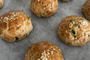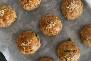 Anne lezzetinde bir poğaça düşünün ama siyez unu ve keten tohumu ile de modern mutfağa göz kırpıp, sağlıklı tariflere de selam çakıyor. Hani bir oturuşta tepsiyi bitirdik deriz ya, yanına domates salatalık, bir demlik çay ile tepsiyi bitirin.