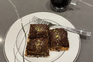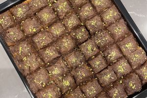 - Üzerini süslemek için kakaoyu süzgeç yardımı ile baklavanın her yerine gezdirip üzerini toz fıstık ve çikolatayla süsleyerek servis edelim. Afiyet olsun.